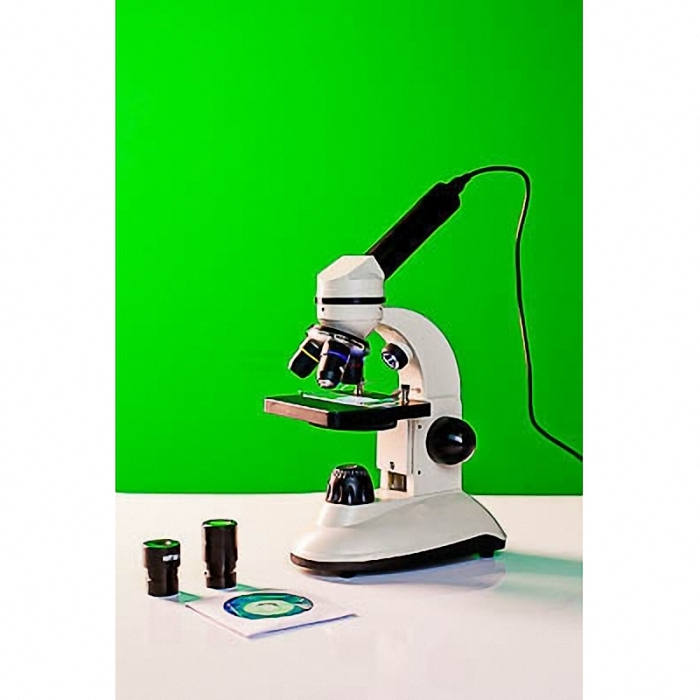 Микроскоп укомплектован объективами 4Х, 10Х, 40Х; револьверным барабаном для быстрой смены объективов; нижней и верхней подсветкой. Поворотом барабана и сменой окуляров и камеры изменяется увеличение микроскопа. Освещенность предметного стекла регулируется диафрагмой (расположена под предметным столиком).Для работы с микроскопом необходимы три батарейки АА по 1,5 В.