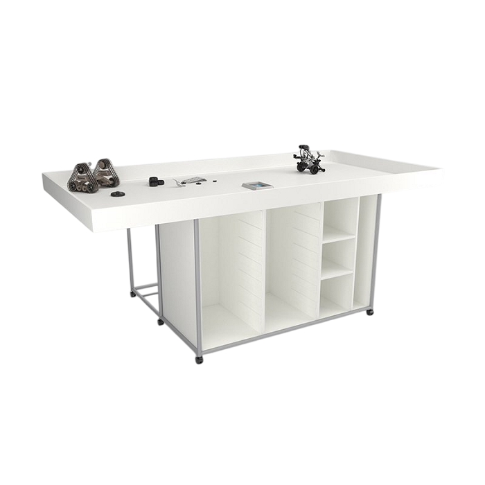 Для оборудования комфортного рабочего и учебного пространства. Полки и контейнеры для хранения деталей для конструирования, позволяют удобно систематизировать всё нужное ученикам и преподавателю. Стол очень просторный, с помощью него можно проводить не только демонстрации возможностей сконструированных механизмов, но и организовывать небольшие импровизированные соревнования, бортики, расположенные по периметру столешницы уберегут от падения изобретений детей на пол и будут препятствием нанесению случайных травм ребятам.