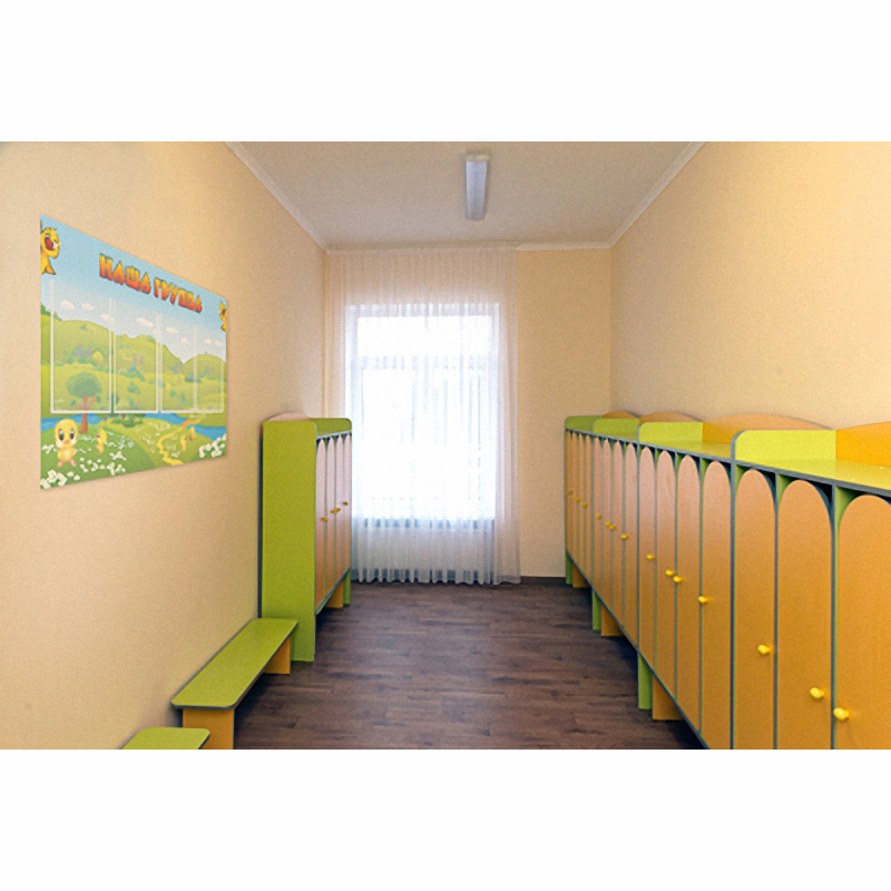 Карманы расположены в один ряд, имеет прозрачно-молочный цвет. Стенд имеет название «Наша группа», написанное большими заглавными буквами.