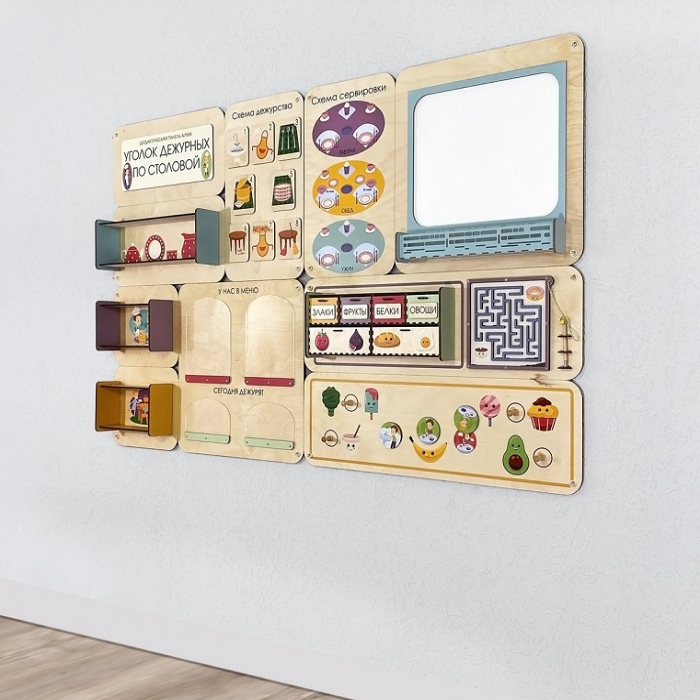 - Занятия с панелью «Уголок дежурных по столовой» нацелены познакомить детей с меню питания, графиком дежурств, полезными продуктами, правильным поведением за столом. Дети приобщаются к посильной работе, учатся заботиться о коллективе.