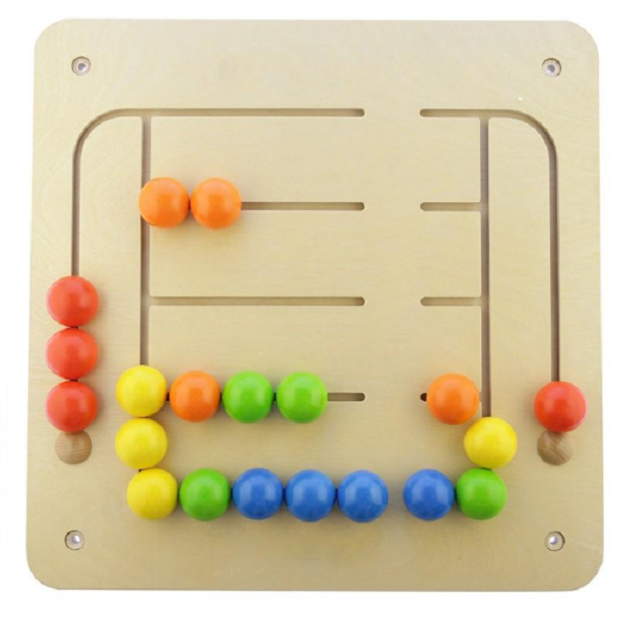 Ребенок, передвигая бегунки по лабиринту, сортирует их по цветам. Может задействовать как одну руку, так и две руки одновременно. Панель помогает в изучении цветов, способствует развитию межполушарных связей.
