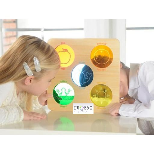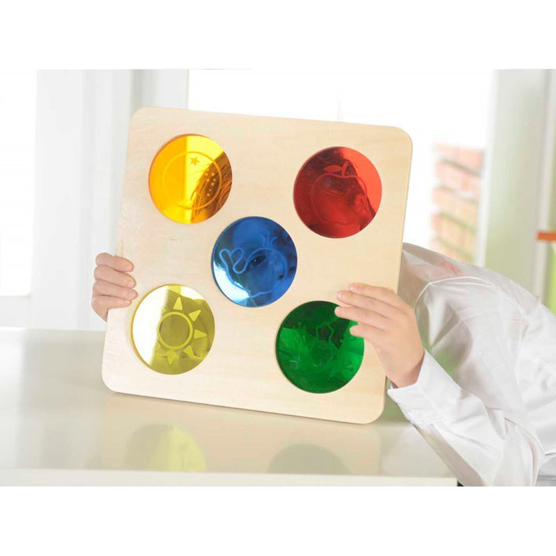 Основание панели выполнено из березовой фанеры, на поверхности которой представлены 5 полупрозрачных кругов в красном, желтом, синем, зеленом и оранжевом цветах. С ее помощью дети могут узнать о разнообразии цветов и весело исследовать мир с помощью цветных кружочков.